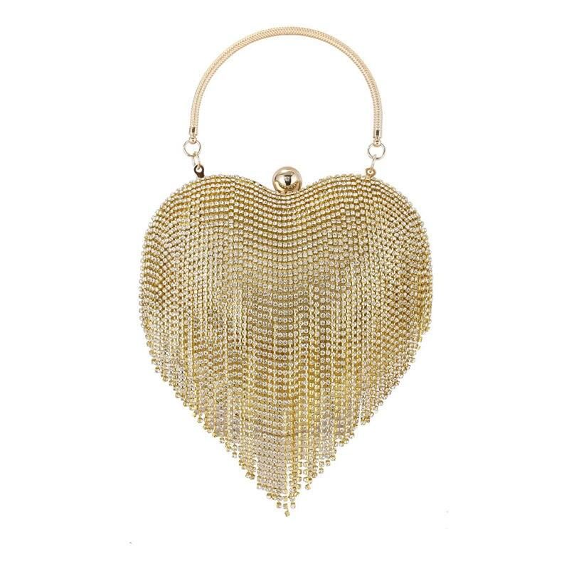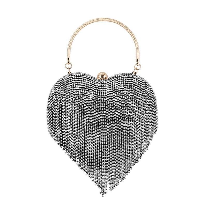 What sets this clutch apart is its unique heart pattern design, illuminated by countless rhinestones that catch the light beautifully. Its hard exterior not only protects your items but also ensures the clutch maintains its shape and sparkle throughout any event. Coupled with its elegant tassel and diamond decoration, this clutch is more than an accessory—it’s a piece of art that complements your finest moments.