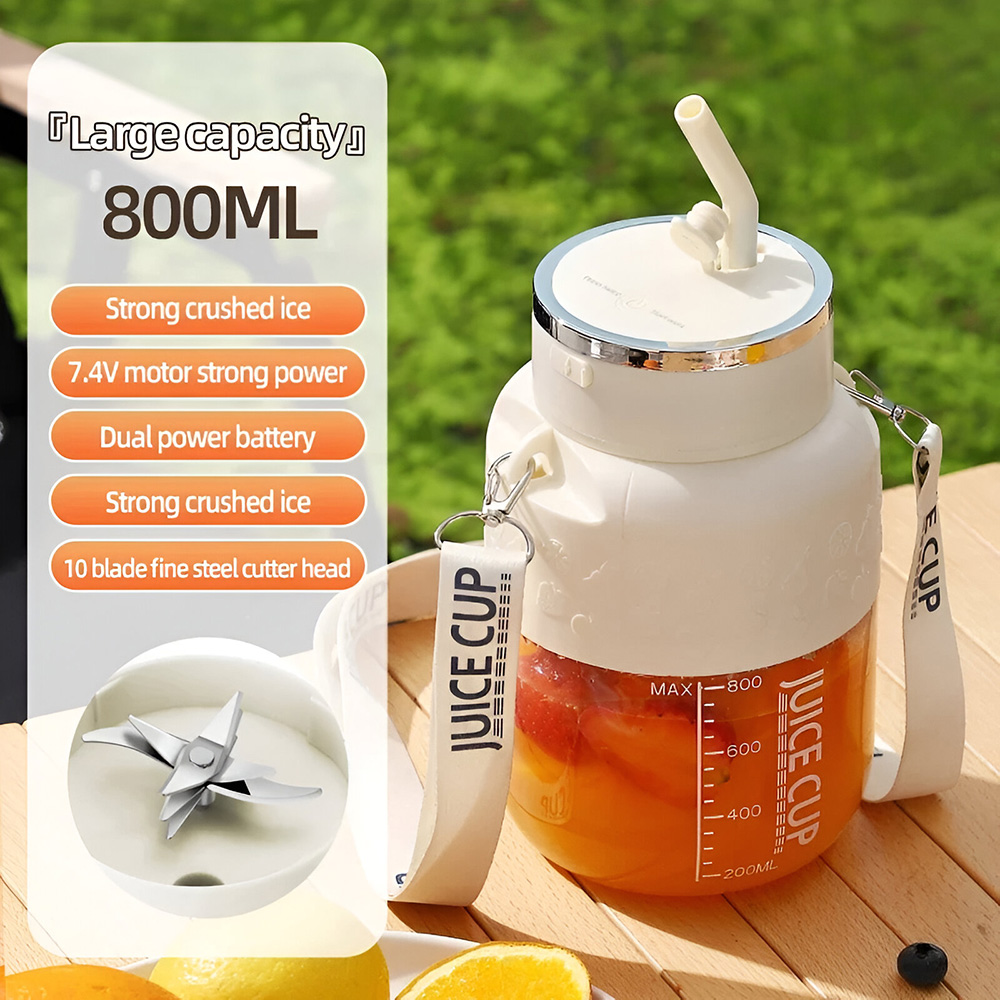 The perfect mix of portability, capacity, and performance. Unlike most portable blenders that compromise on size or power, this juicing cup offers a generous 800ml container, powered by 10 precision blades and a long-lasting battery—all in a sleek 4.7 x 4.7 x 7.5 inch body. It’s simple, cordless, and surprisingly powerful.